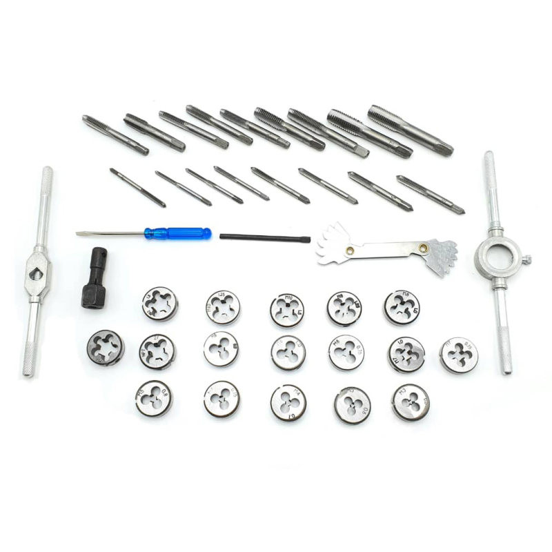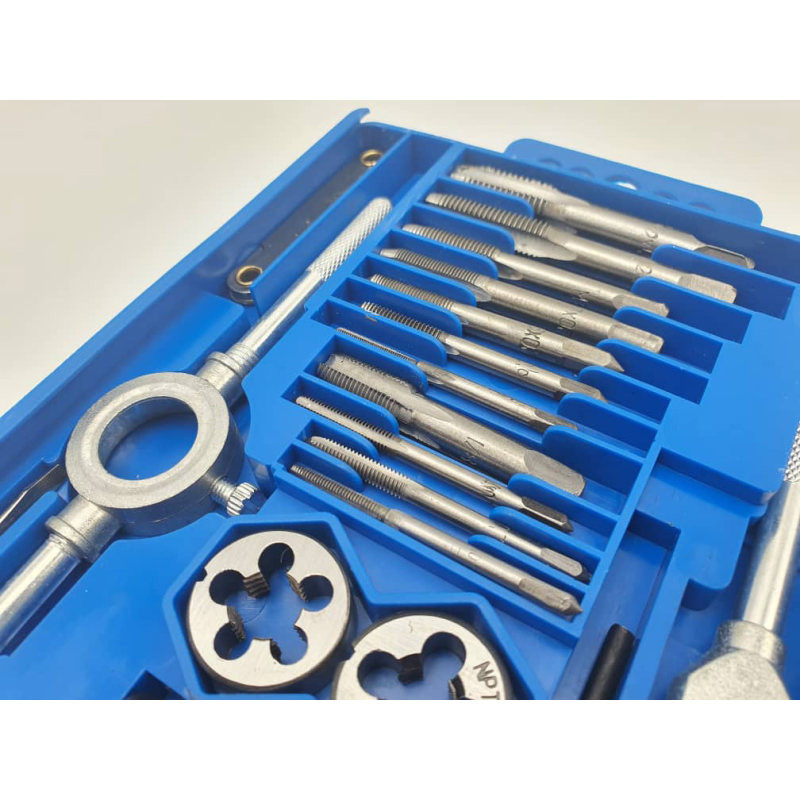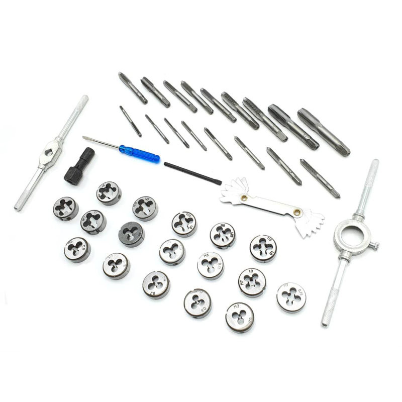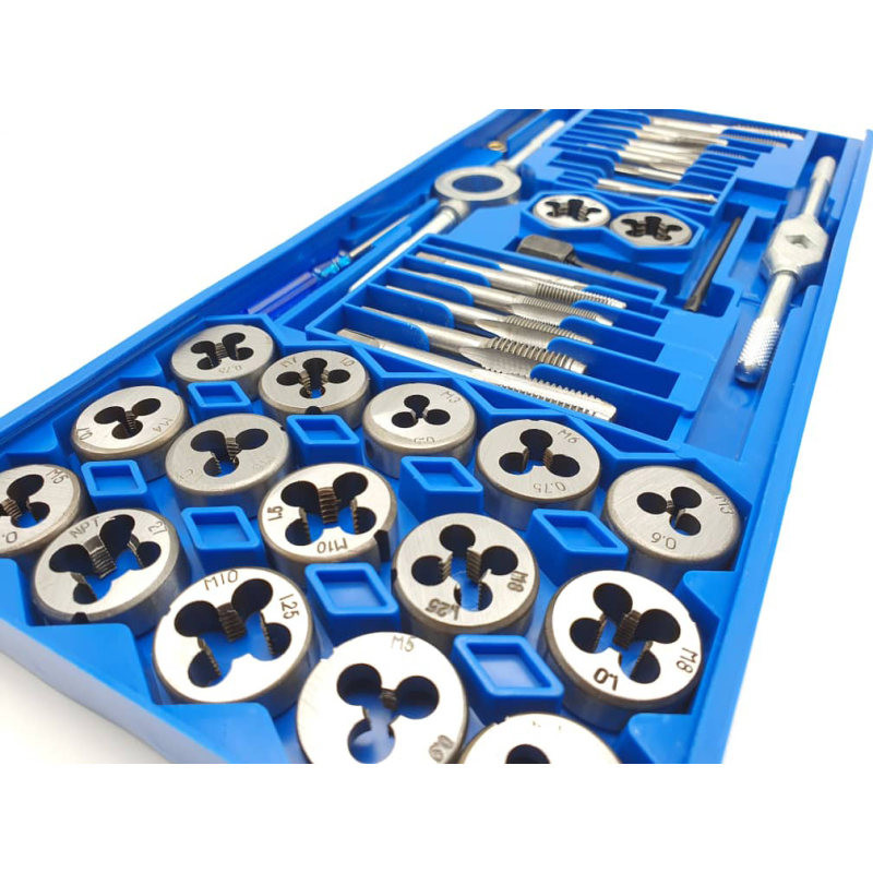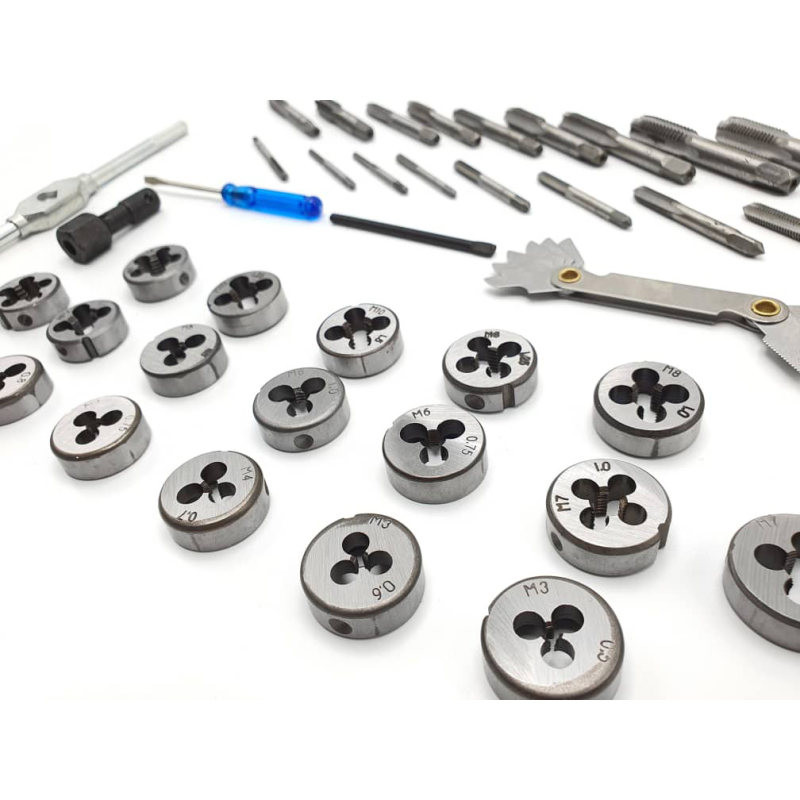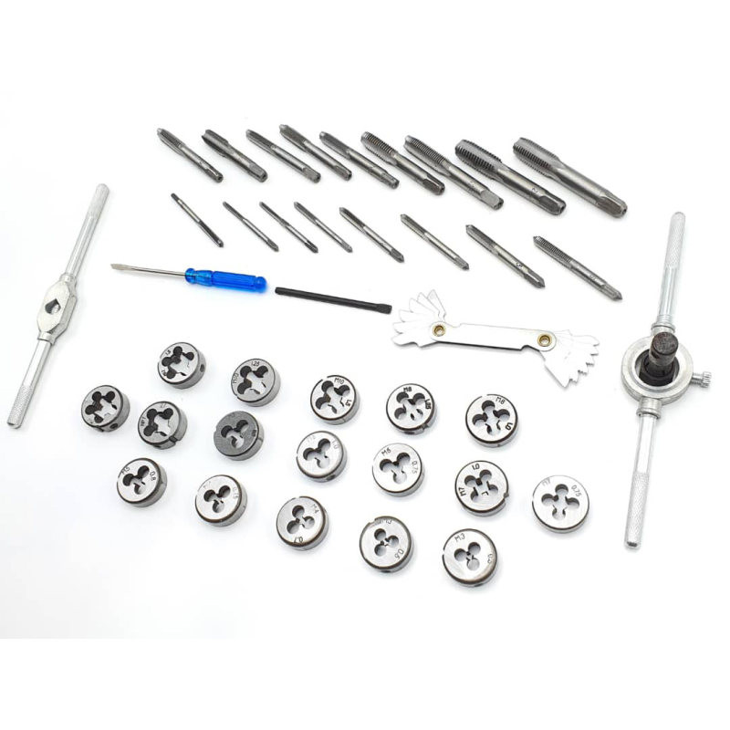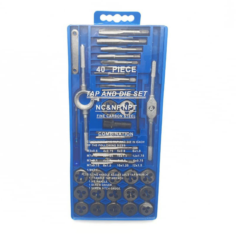 مجموعه 40 پارچه حرفه ای حدیده و قلاویز با کیفیت غیر قابل مقایسه با برندهای مشابه ، تولید شده از بهترین متریال موجود نسبت به قیمت می باشد . آلیاژ : فولاد سخت ، دارای 17 نمره قلاویز و 17 نمره حدیده از شماره 0.5 تا 1.75 ، دارای 1 عدد دسته قلاویز گردان افقی و 1عدد دسته قلاویز گردان عمودی و 1 عدد حدیده گردان و 1 عدد گام سنج میلیمتر و1 عدد پیچ گوشتی می باشد . ابعاد : 14 × 31 و وزن این محصول یک کیلوگرم میباشد . کشور تولید کننده : چین