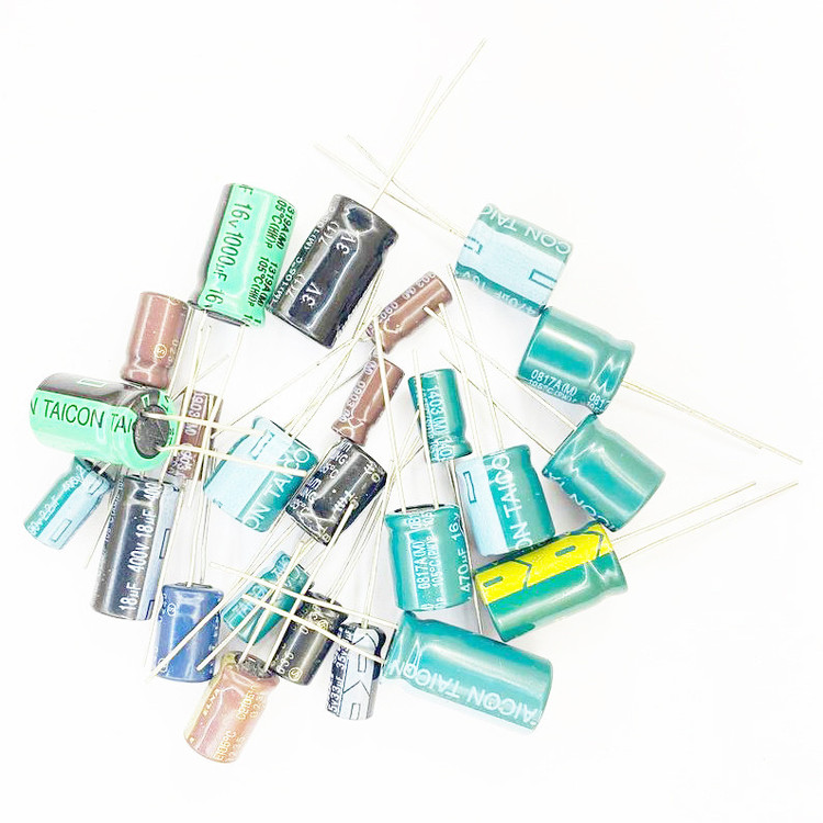 100 عدد انواع خازن الکترولیتی در ولتاژهای 6.3 و 10 و 25 و 35 و 50 و 400 و 63 از 1 میکروفاراد تا 1000 میکروفاراد